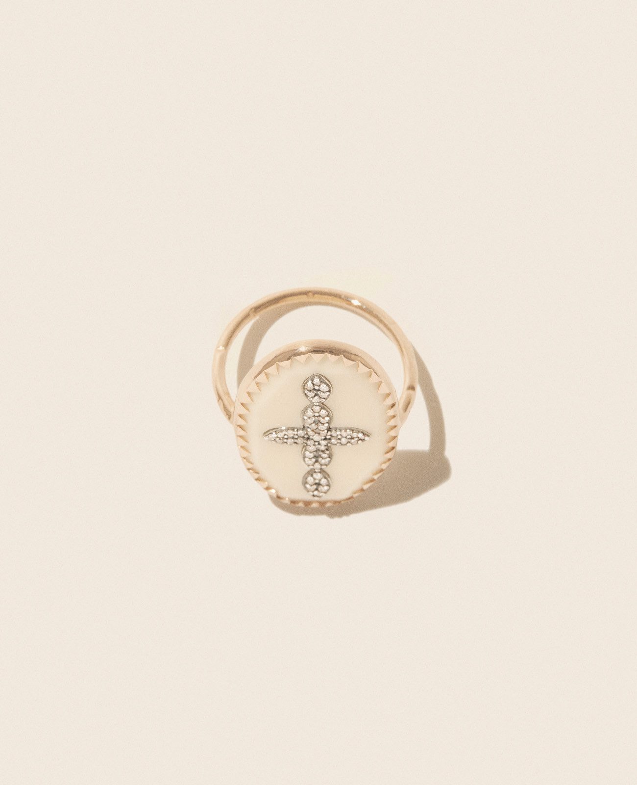 L’iconique bague Bowie de Pascale Monvoisin dans sa troisième déclinaison, l’ovale. Or rose 9 carats, argent, résine blanche, diamants.